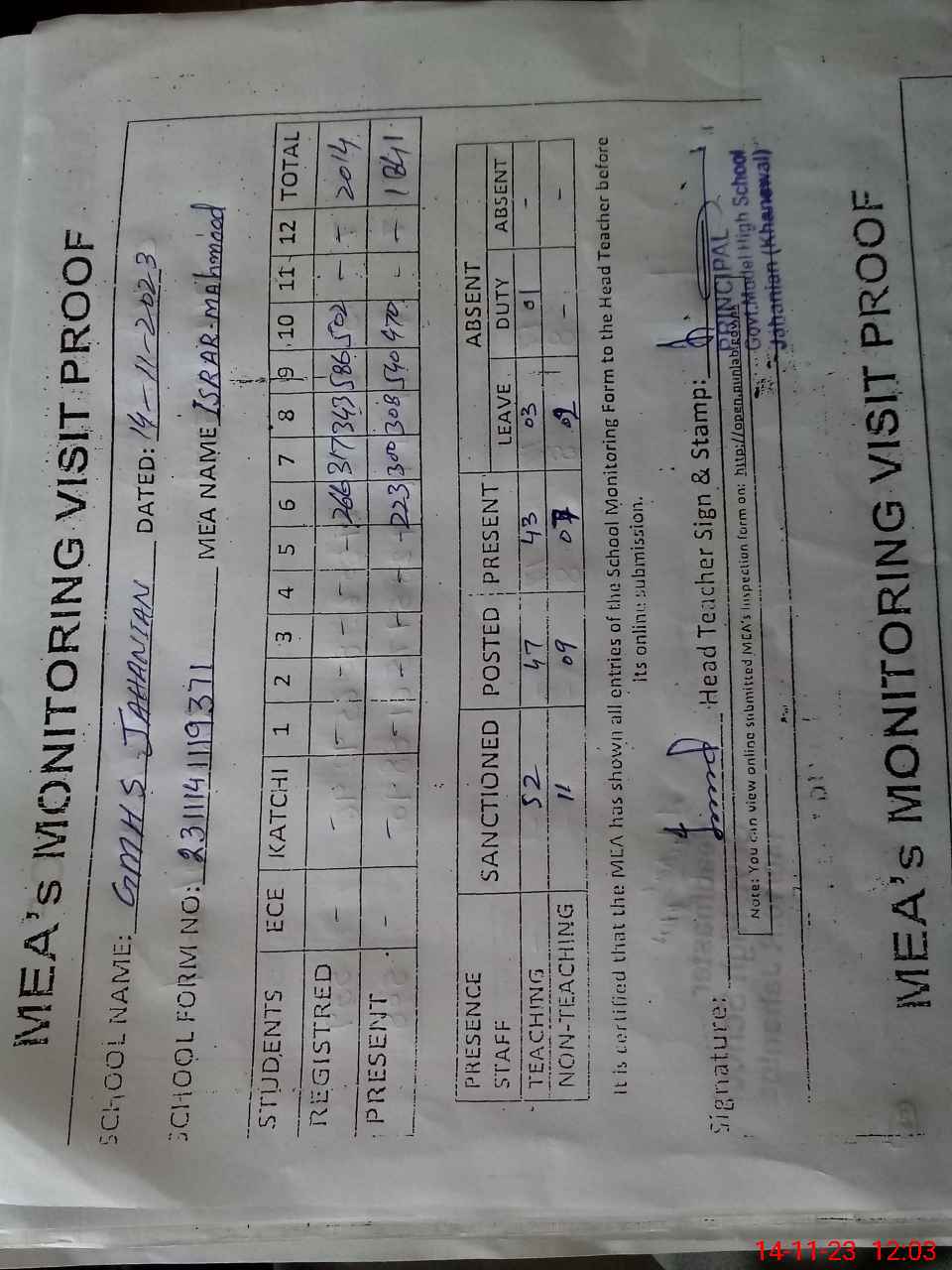 | Attendance Register | Head Teacher | MEA with School | Visit Proof |