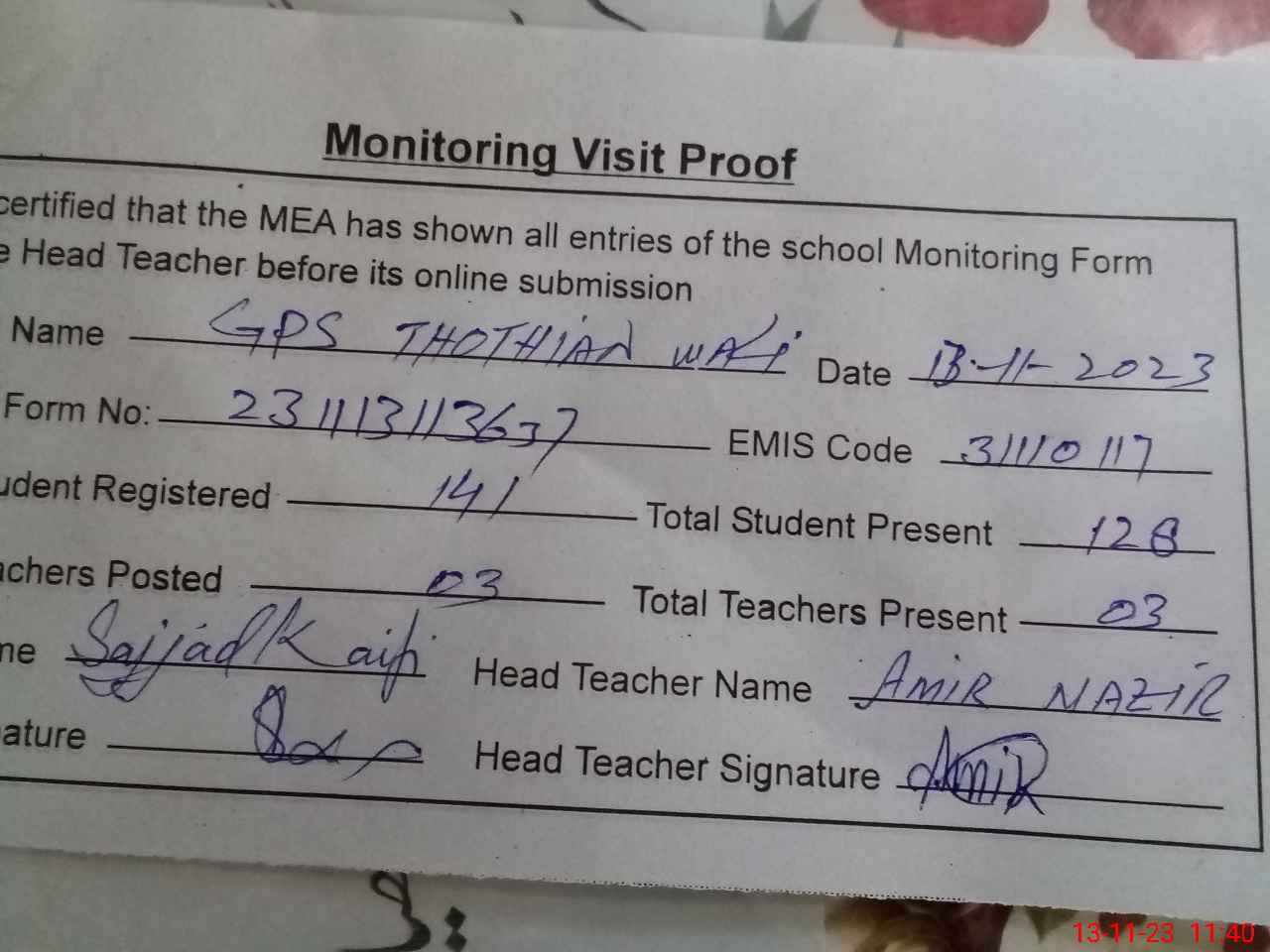 | Attendance Register | Head Teacher | MEA with School | Visit Proof |