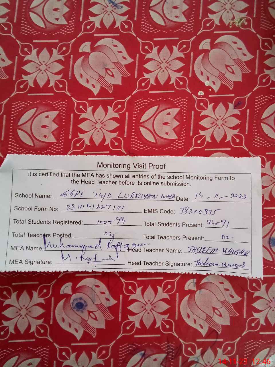 | Attendance Register | Head Teacher | MEA with School | Visit Proof |