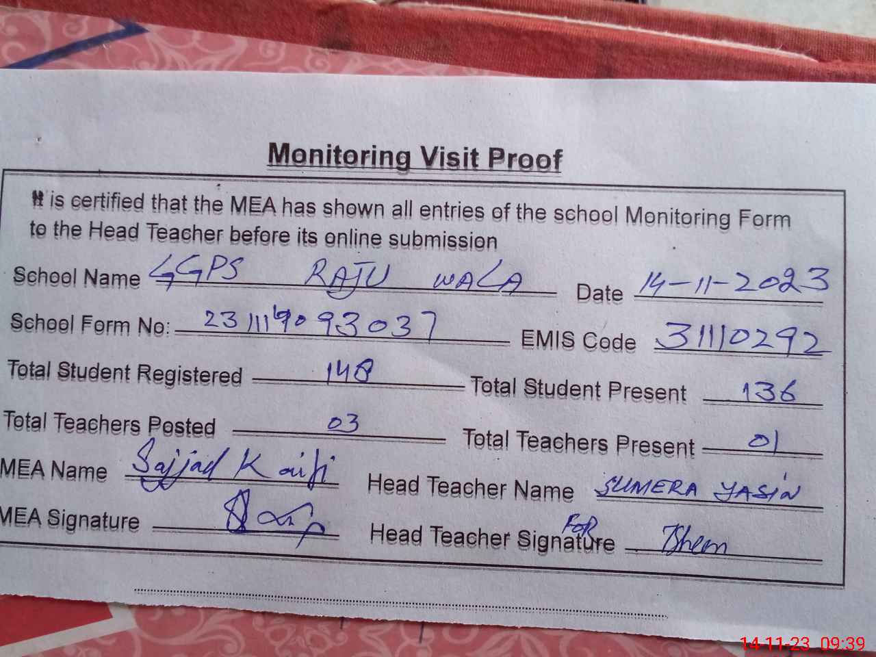 | EMIS Code: 31110292 | Name of School: GGPS RAJU WALA | |||