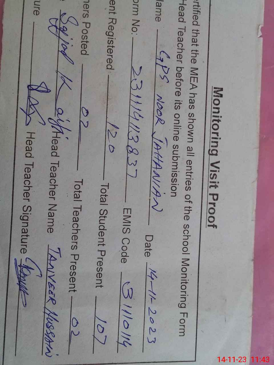 | EMIS Code: 31110114 | Name of School: GPS NOOR JAHANIAN | |||