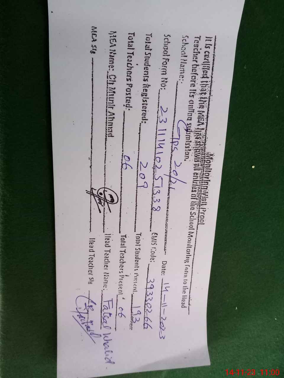 | Certified that this School was Inspected by the Undersigned MEA/DMO Today and the Information Stated Above is as Per Record. | |||||