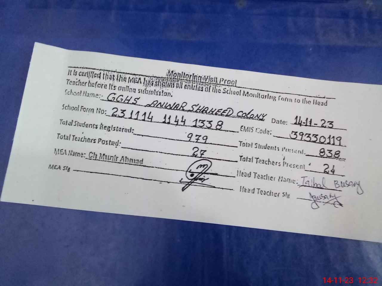 | Attendance Register | Head Teacher | MEA with School | Visit Proof |
