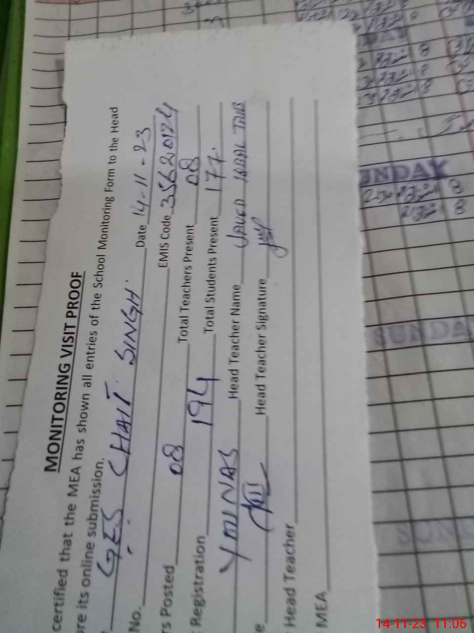 | Attendance Register | Head Teacher | MEA with School | Visit Proof |