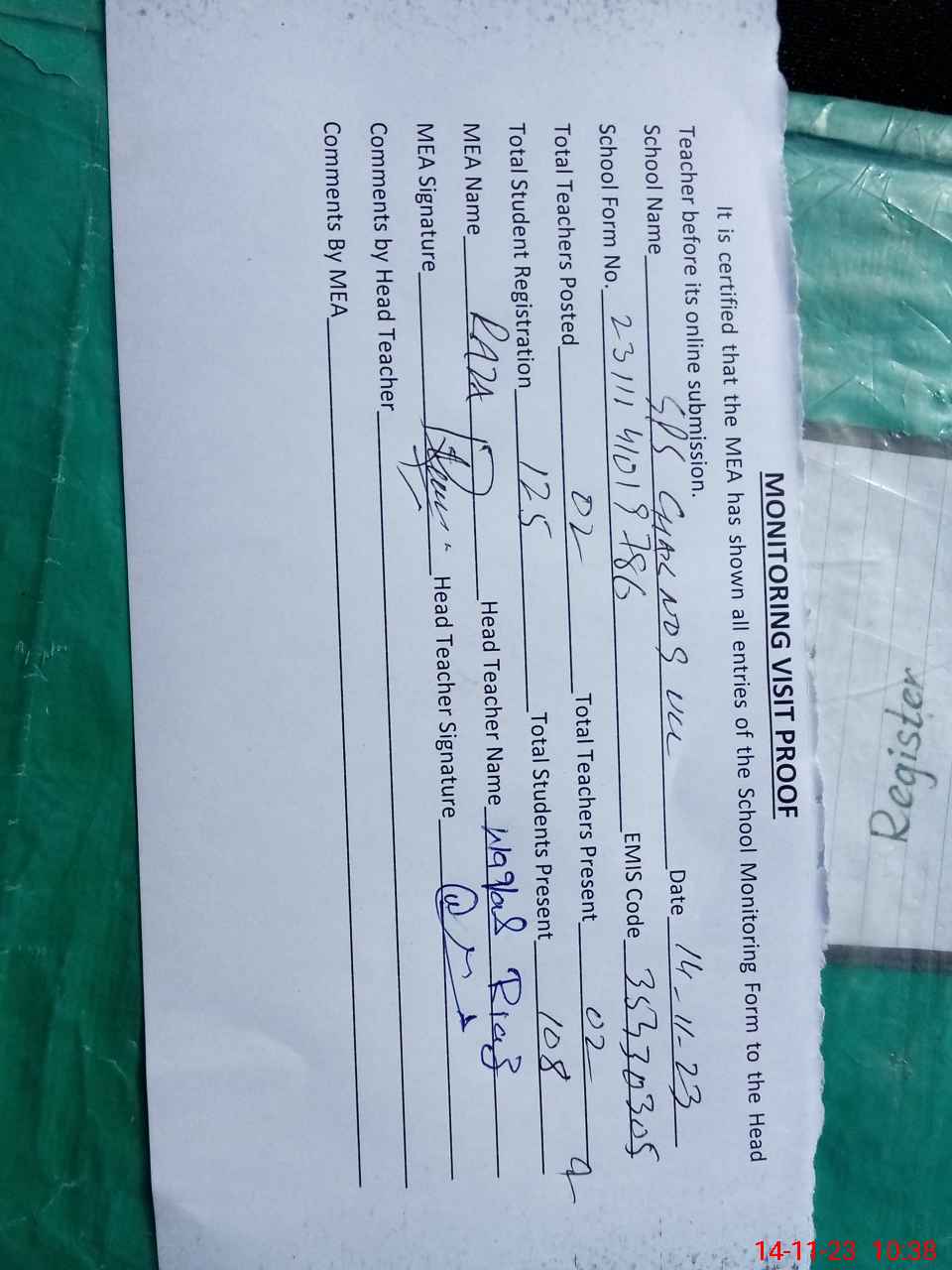 | Attendance Register | Head Teacher | MEA with School | Visit Proof |