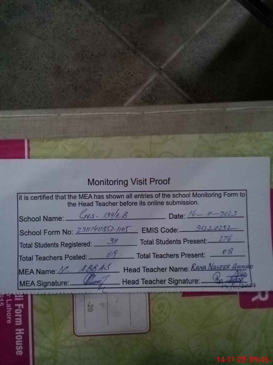 | Attendance Register | Head Teacher | MEA with School | Visit Proof |