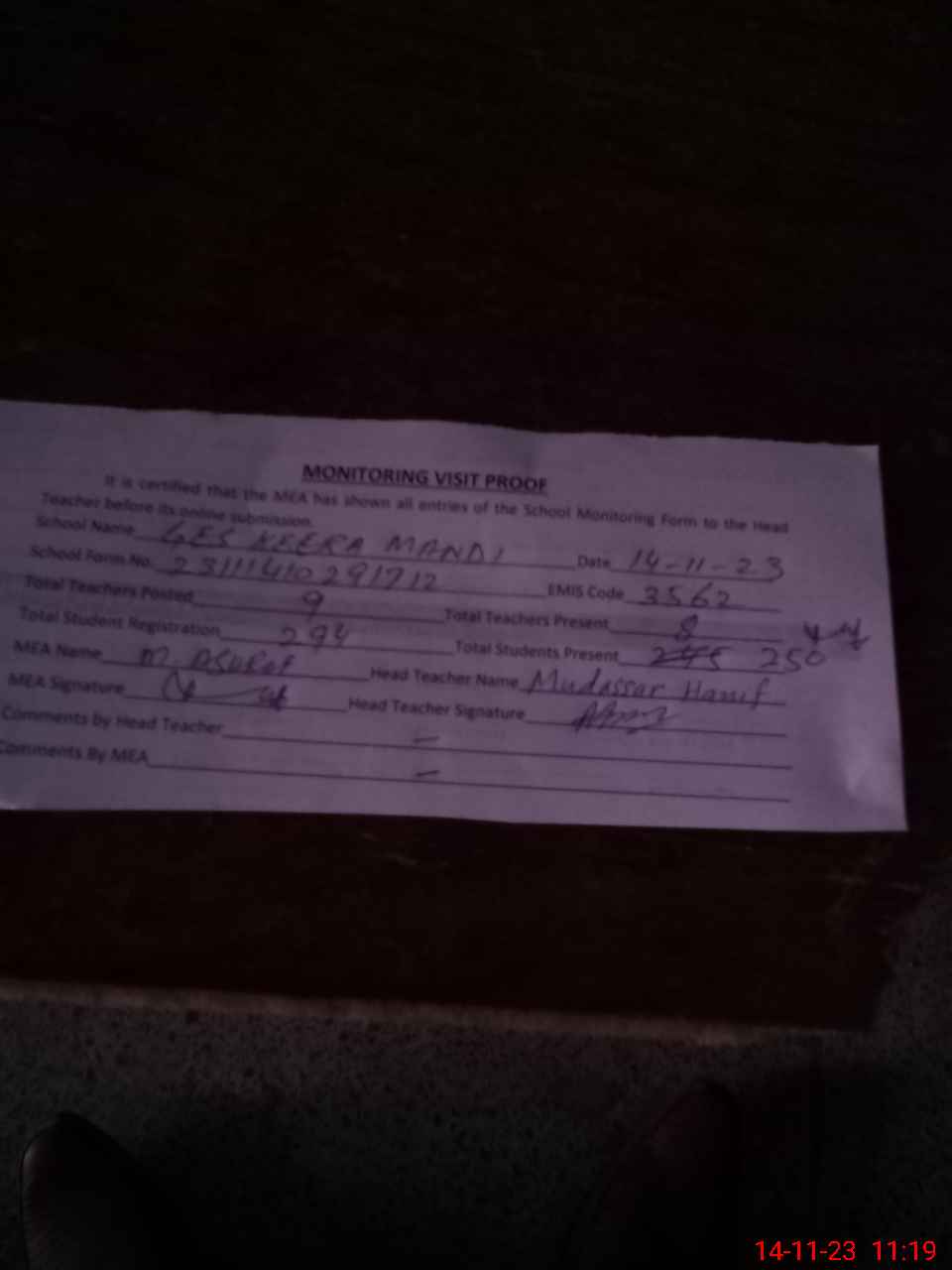 | Attendance Register | Head Teacher | MEA with School | Visit Proof |