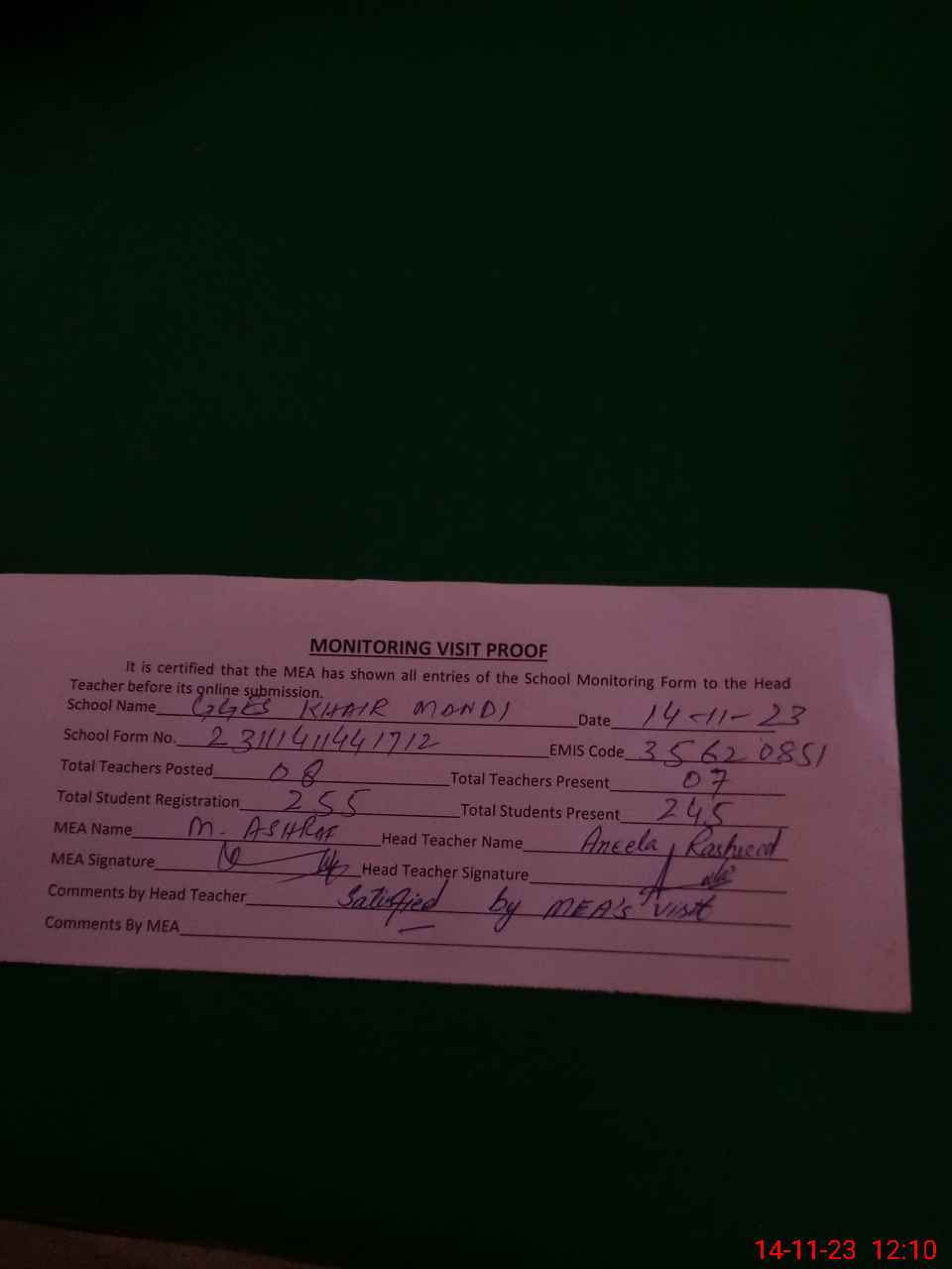 | Attendance Register | Head Teacher | MEA with School | Visit Proof |