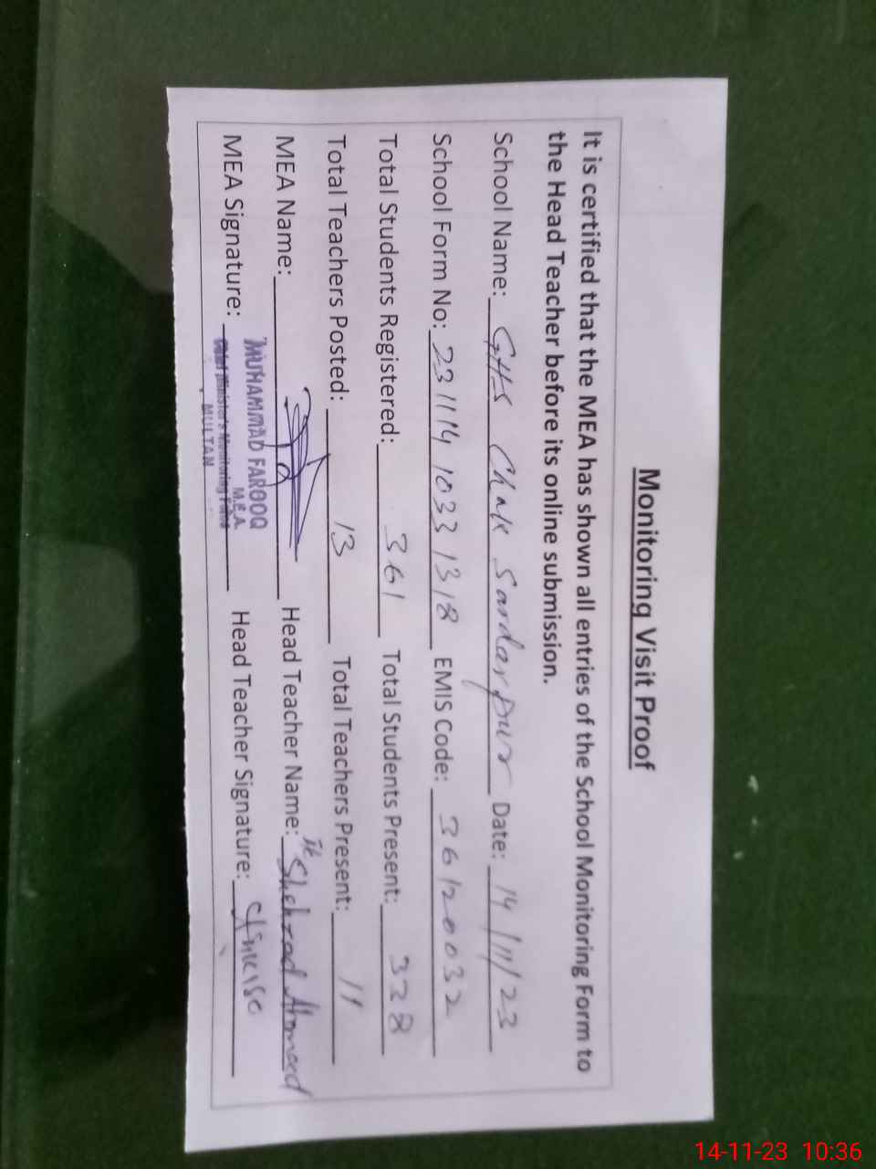 | Attendance Register | Head Teacher | MEA with School | Visit Proof |