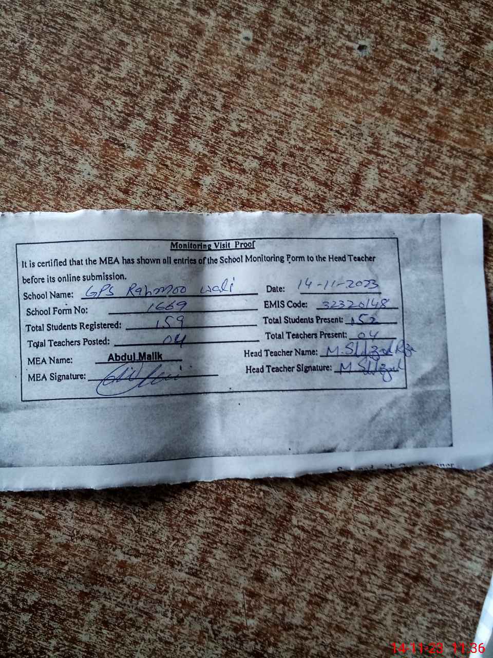| Attendance Register | Head Teacher | MEA with School | Visit Proof |