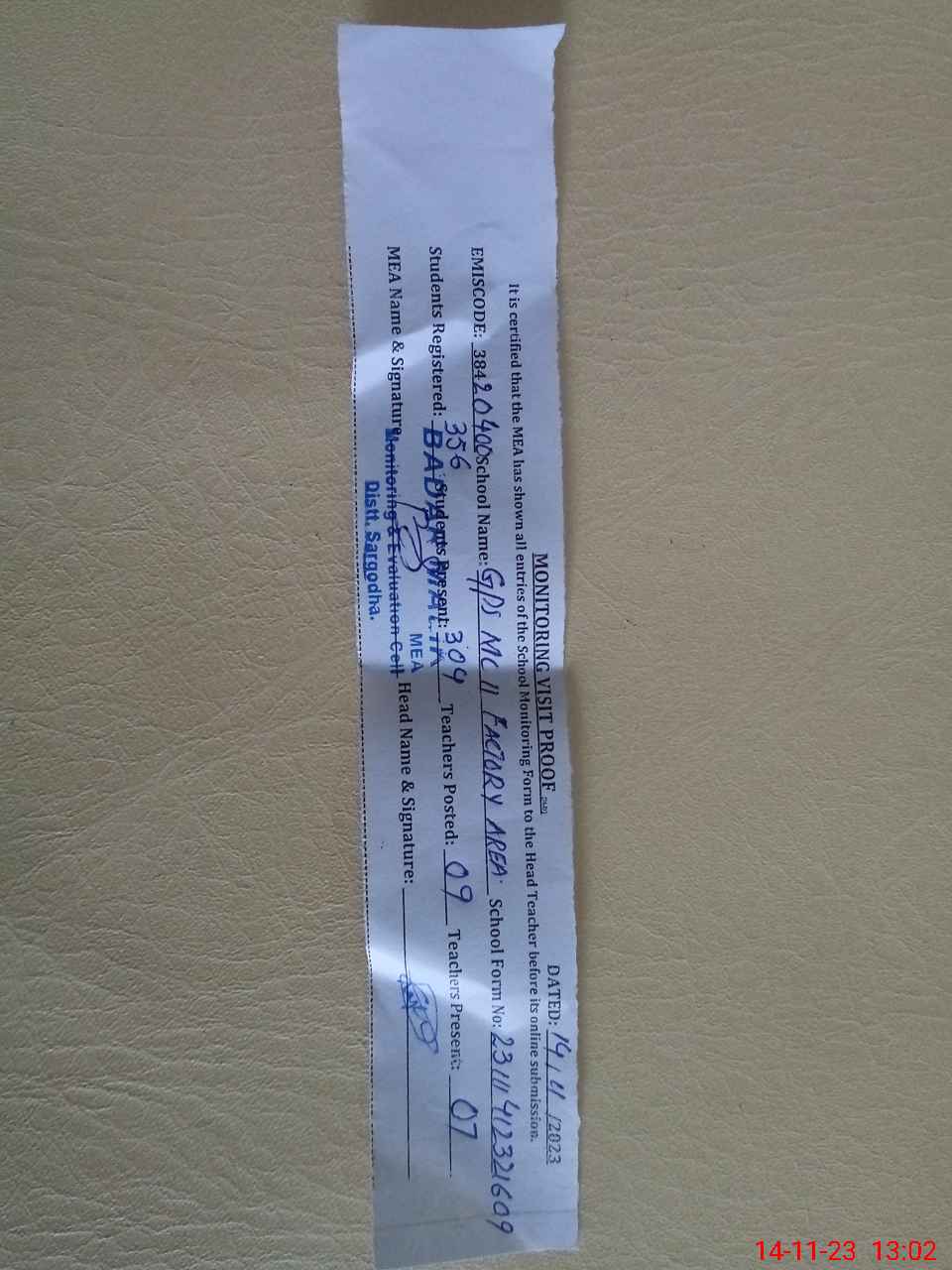 | EMIS Code: 38420400 | Name of School: GPS MC NO. 11 FACTORY AREA SARGODHA | |||