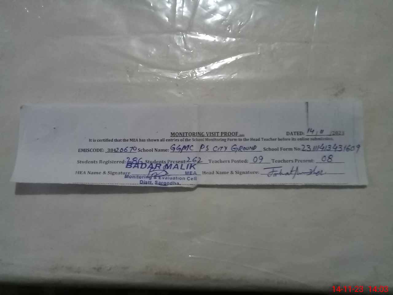 | EMIS Code: 38420670 | Name of School: GGPS MC CITY GROUND SARGODHA | |||
