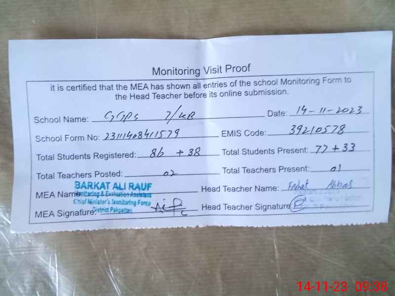 | EMIS Code: 39210578 | Name of School: GGPS CHAK NO. 7 KB | |||