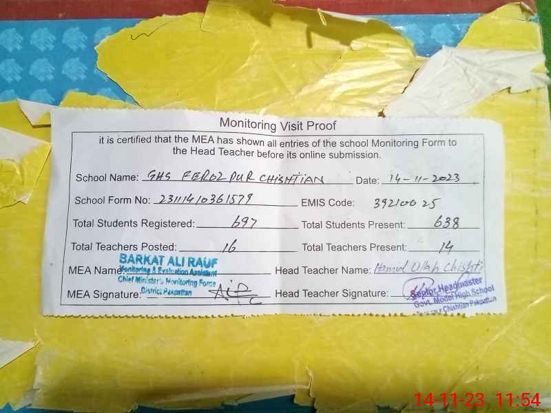 | EMIS Code: 39210025 | Name of School: GHS FEROZPUR CHISHTIAN | |||