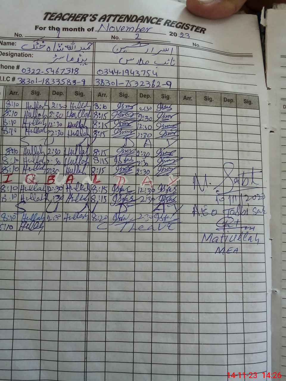 | Name: Is**** Hu**** Designation: (School Headmaster's/Headmistress's) HEADMASTER Phone/Cell Number: 03**** |