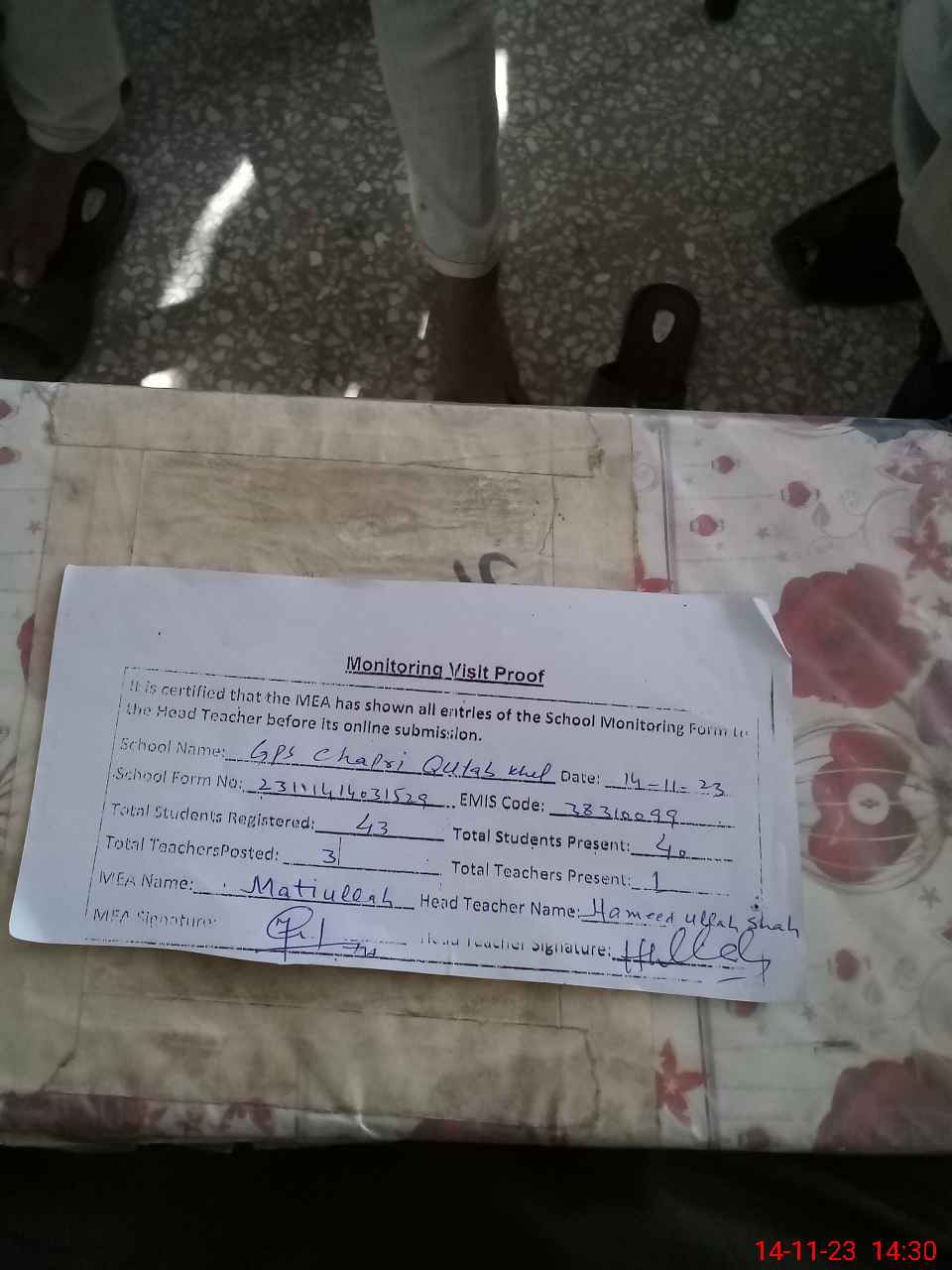 | Attendance Register | Head Teacher | MEA with School | Visit Proof |