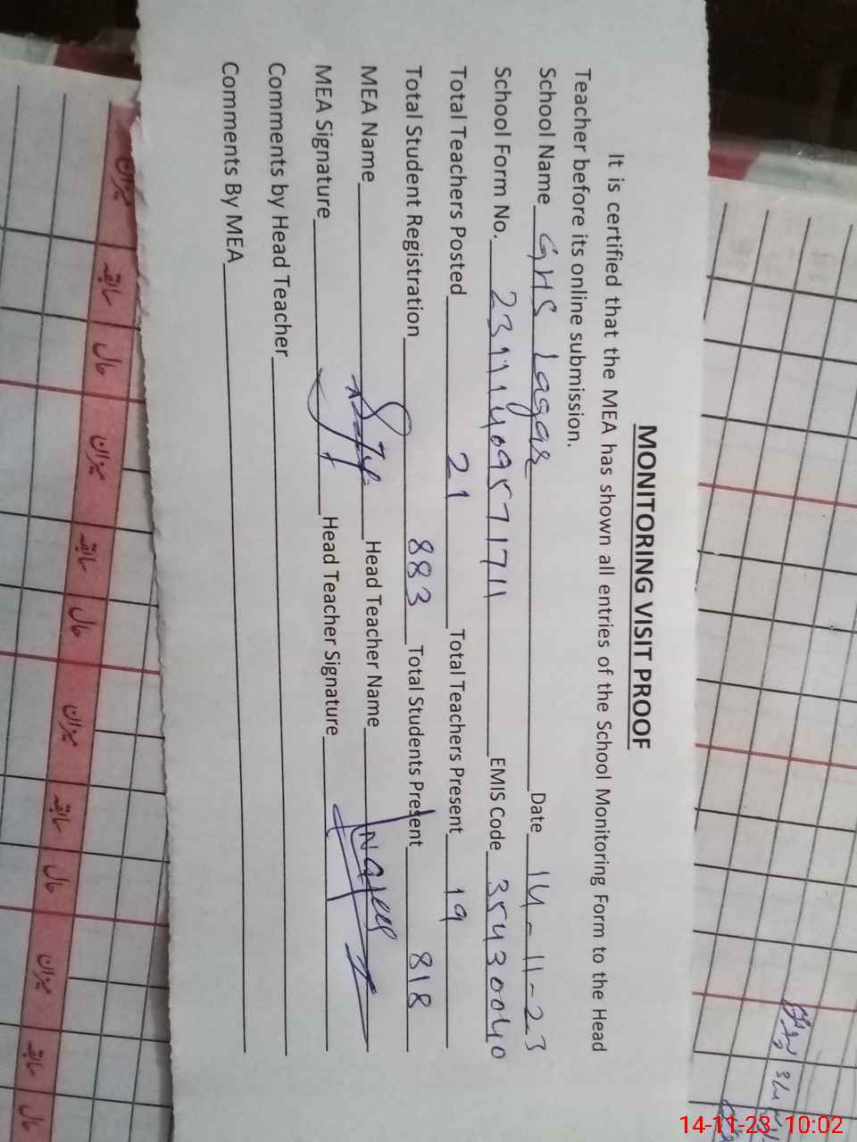| Attendance Register | Head Teacher | MEA with School | Visit Proof |