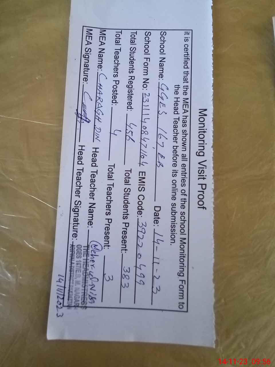 | Attendance Register | Head Teacher | MEA with School | Visit Proof |