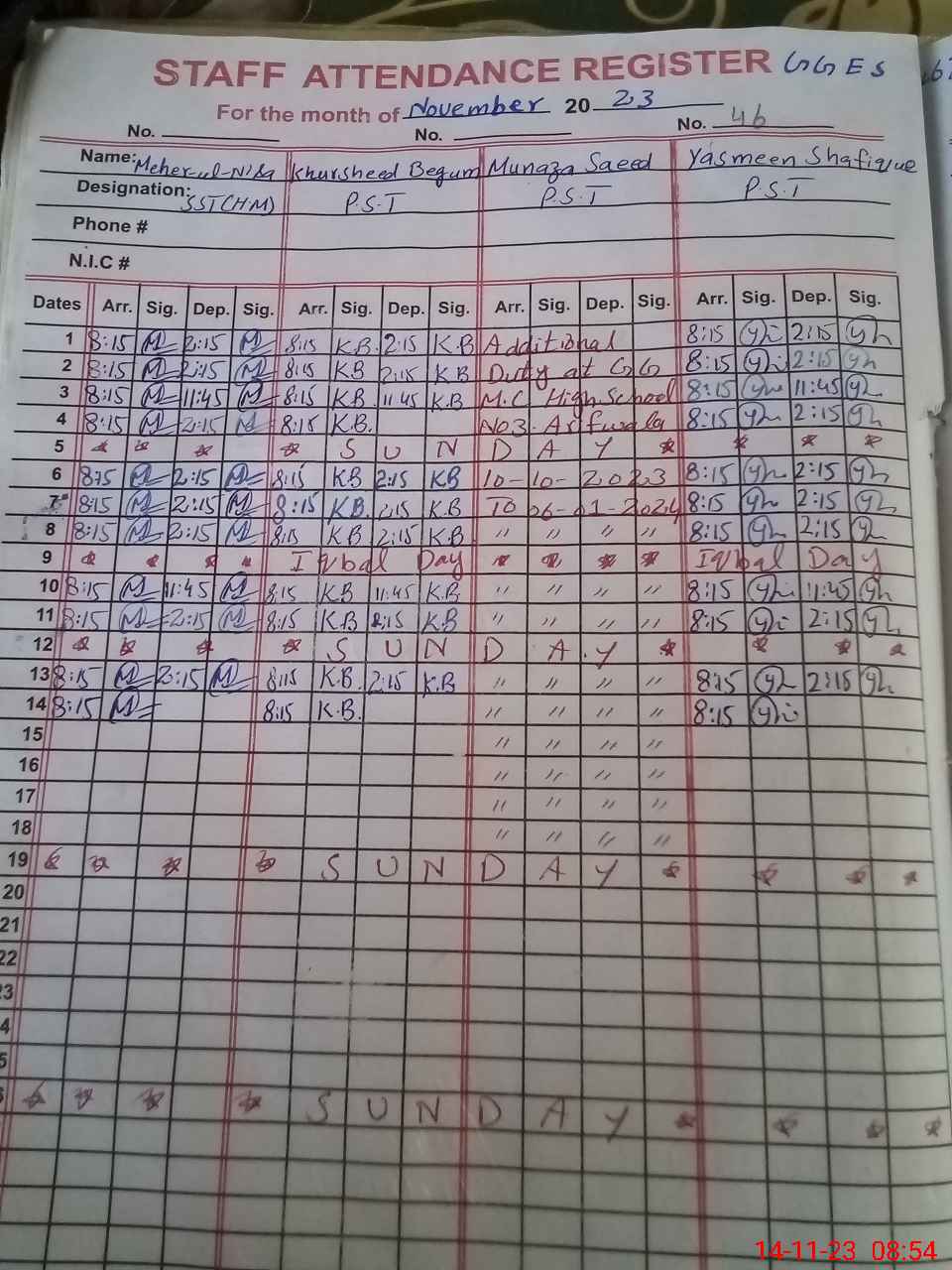 | CNIC | Full Name | Designation | R/C | Absence During Last Calender Month |