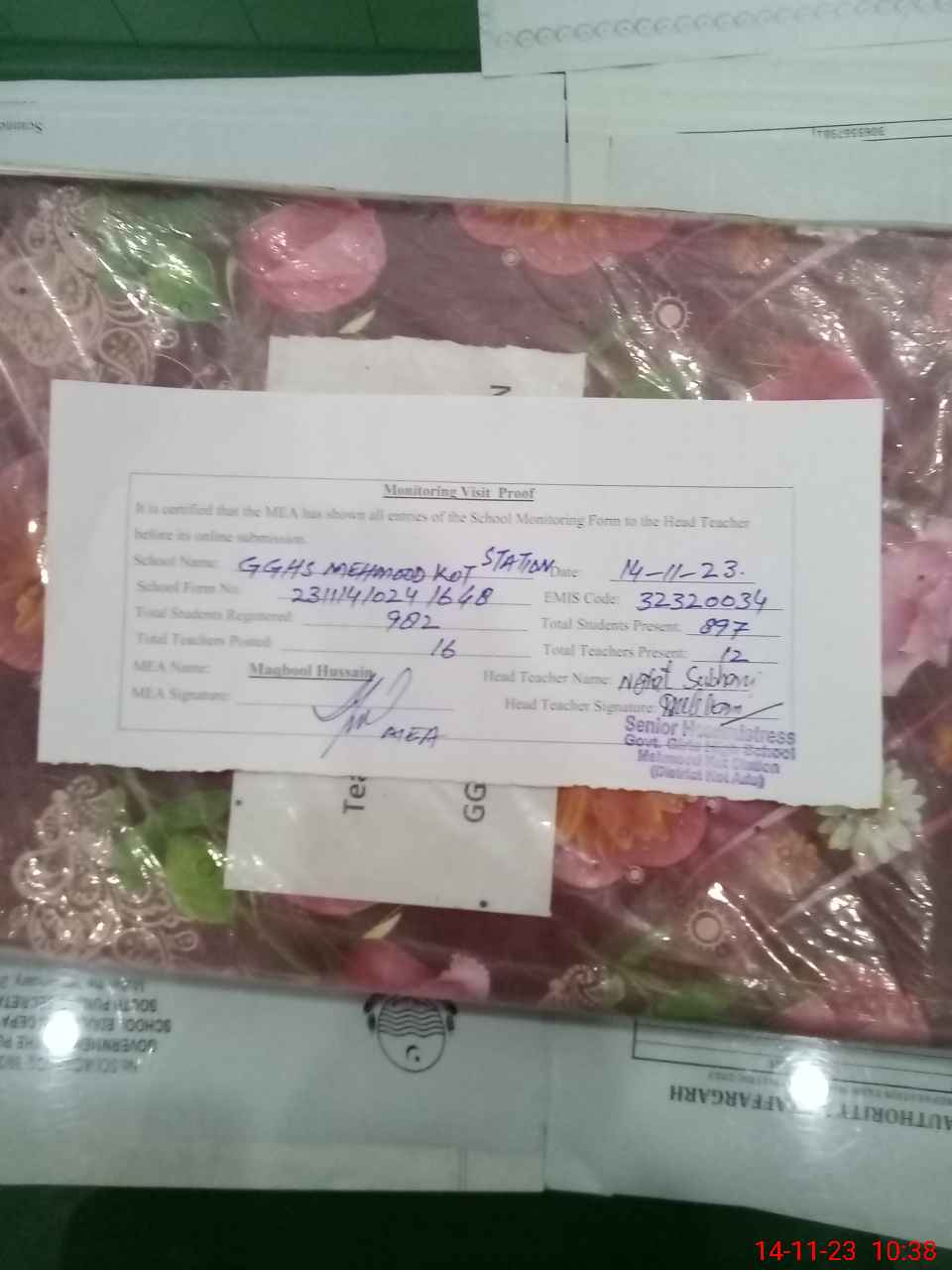 | EMIS Code: 32320034 | Name of School: GGHS MAHMOOD KOT STATION | |||