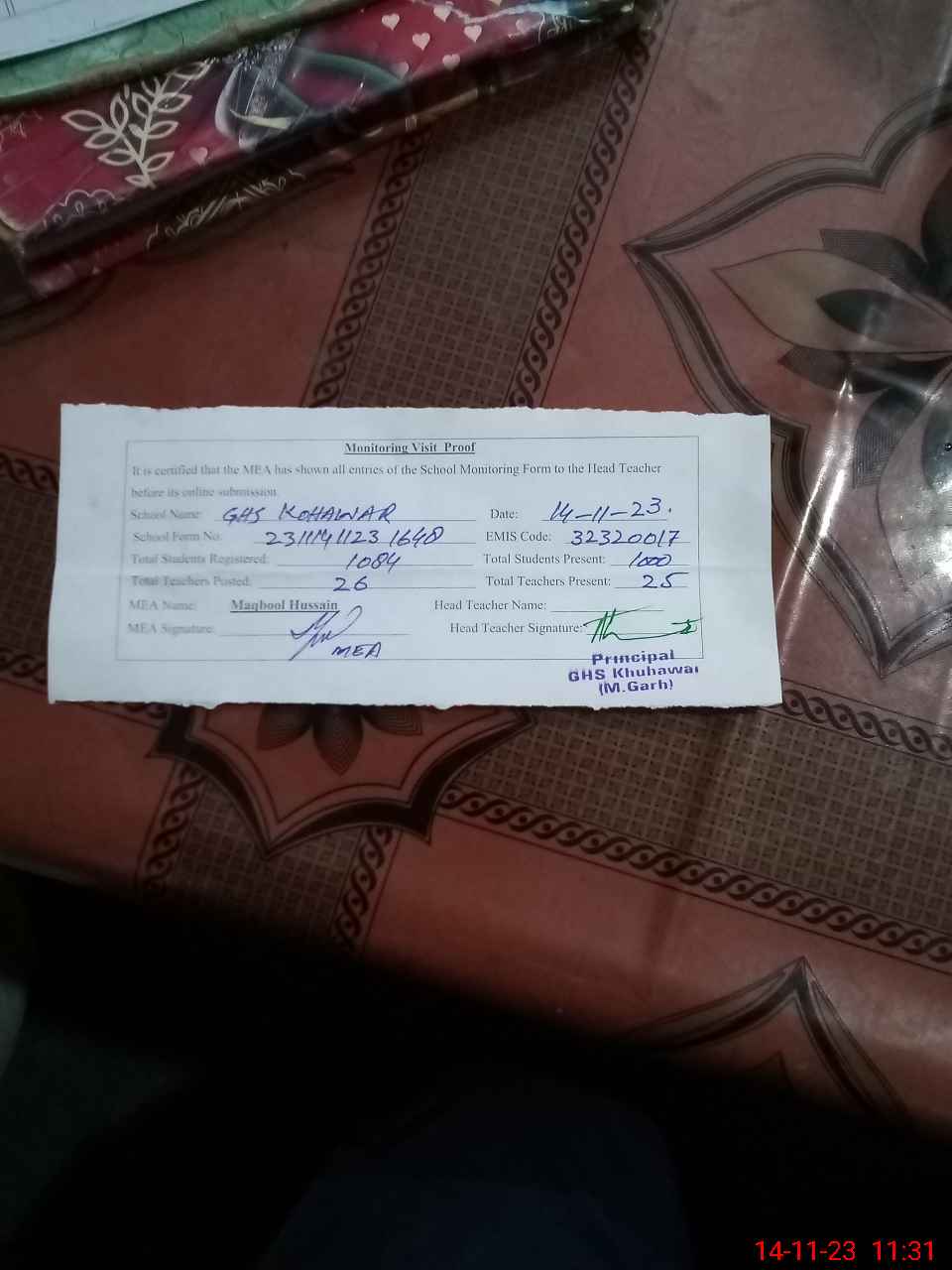 | Attendance Register | Head Teacher | MEA with School | Visit Proof |
