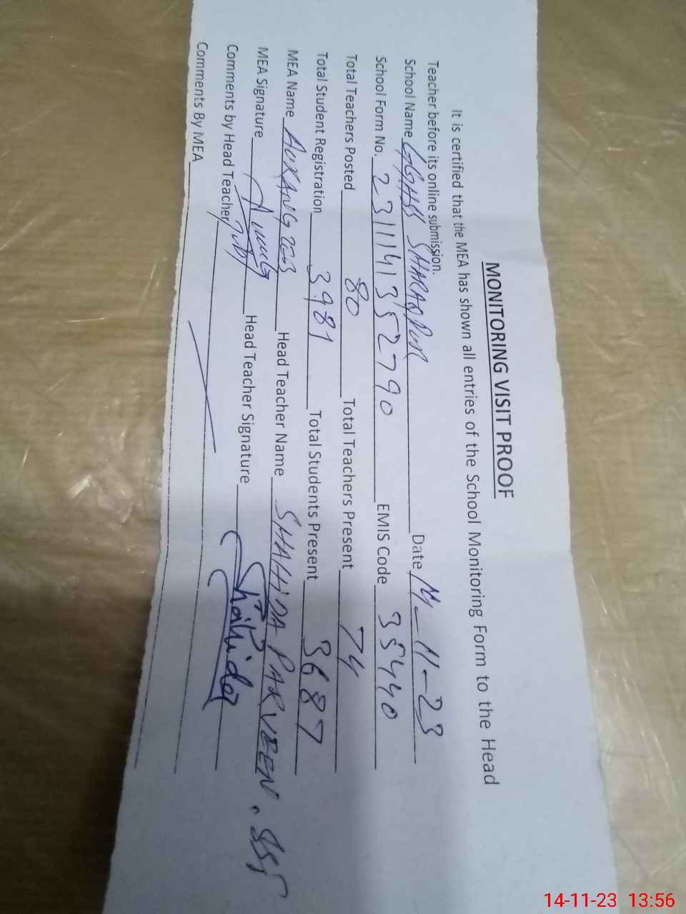 | Attendance Register | Head Teacher | MEA with School | Visit Proof |