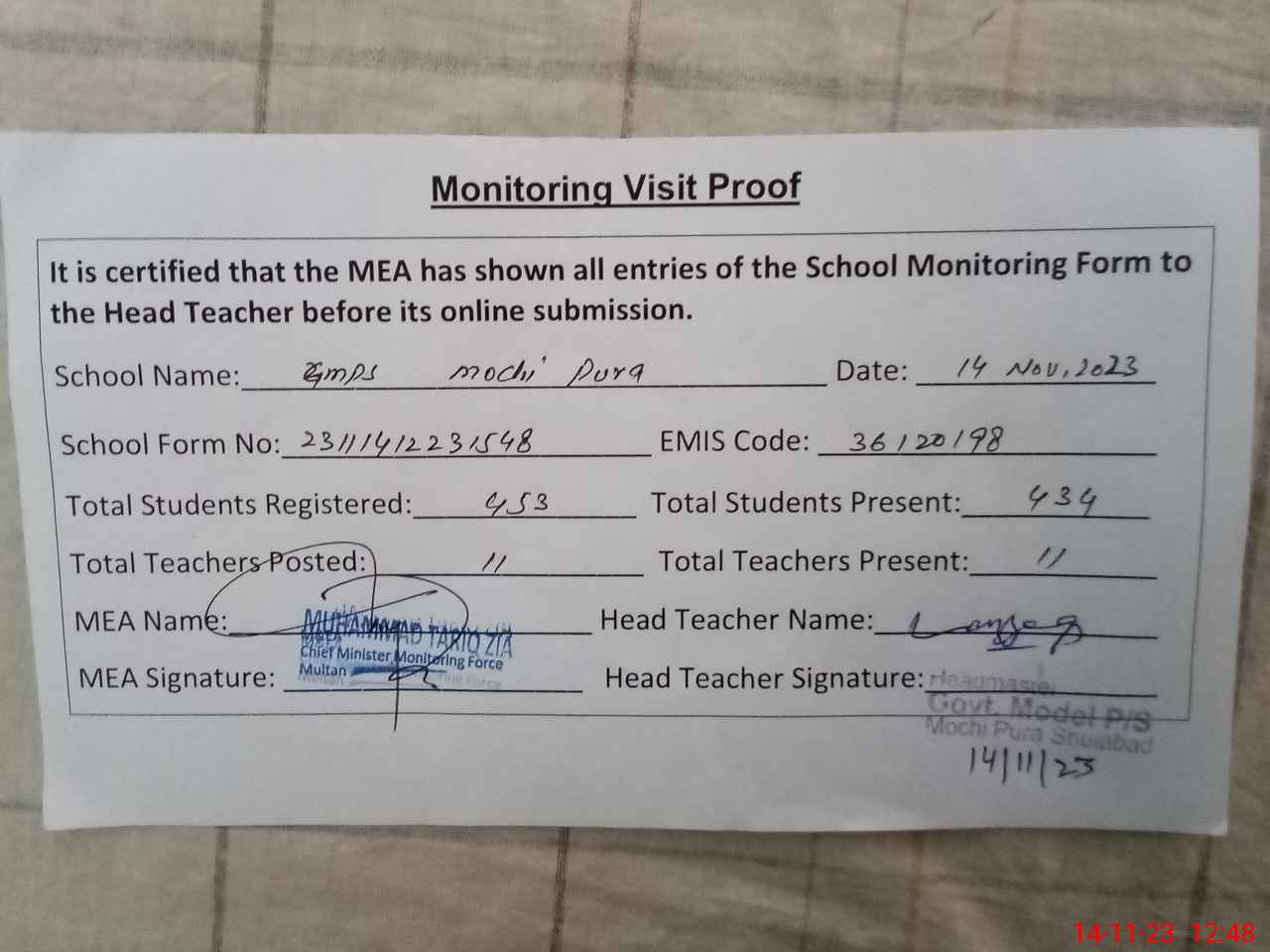 | Attendance Register | Head Teacher | MEA with School | Visit Proof |