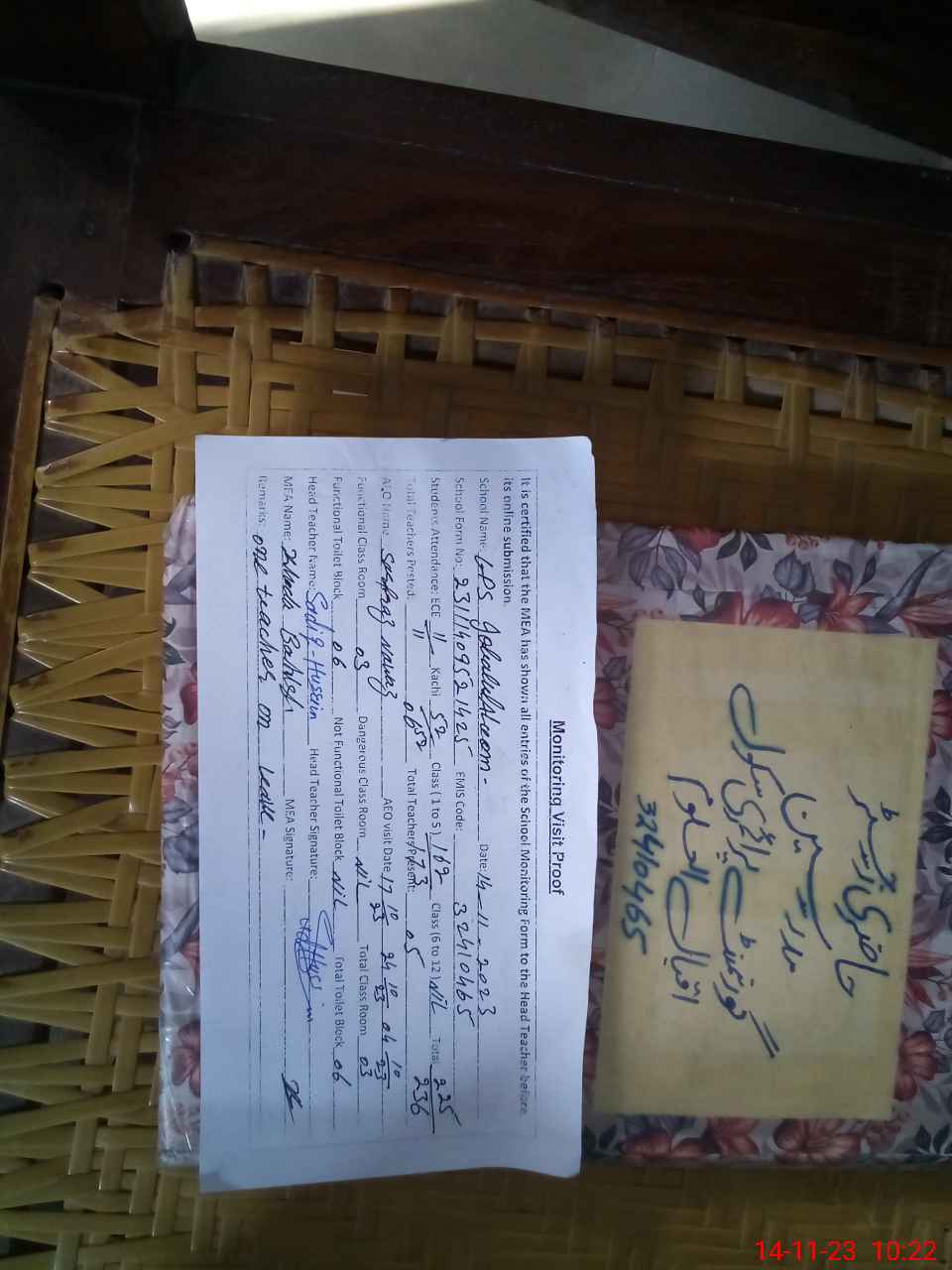 | Name: SA**** HU**** Designation: (School Headmaster's/Headmistress's) HEADMASTER Phone/Cell Number: 03**** |