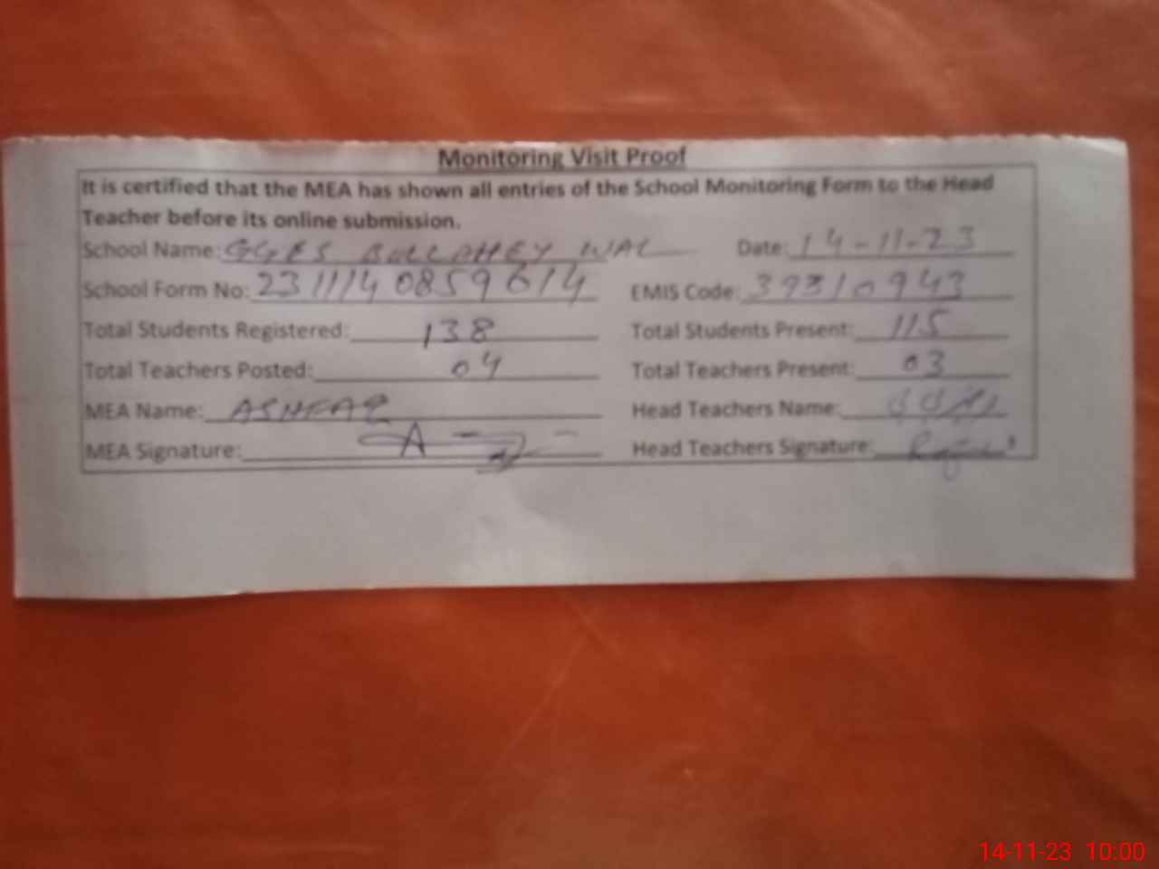 | Attendance Register | Head Teacher | MEA with School | Visit Proof |