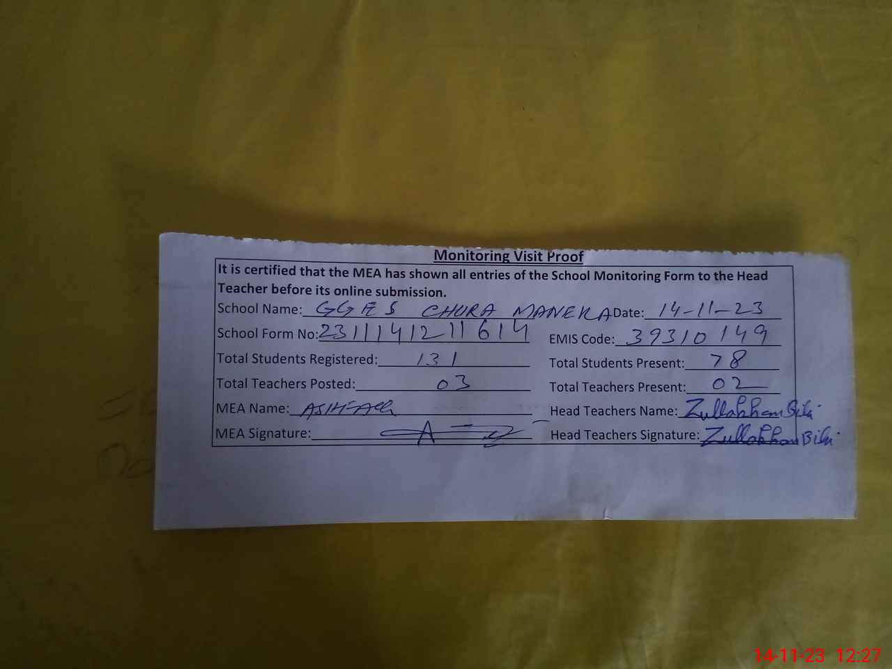 | Attendance Register | Head Teacher | MEA with School | Visit Proof |