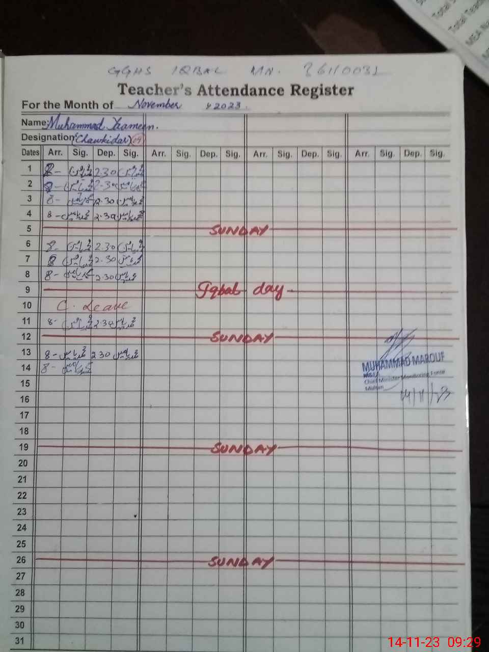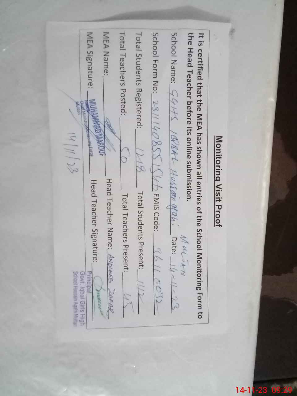 | EMIS Code: 36110032 | Name of School: GGHS IQBAL HUSSAIN AGAHI ROAD MULTAN | |||