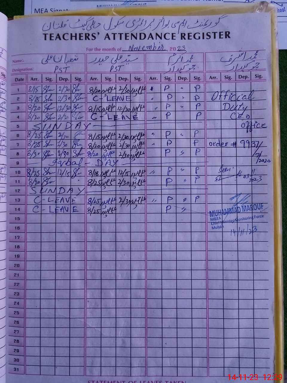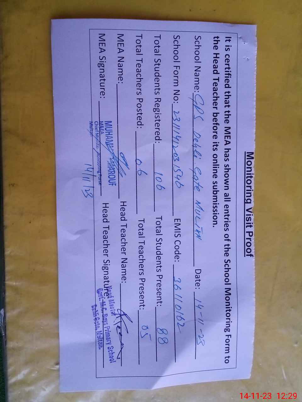 | EMIS Code: 36110162 | Name of School: GPS MC DEHLI GATE MULTAN | |||