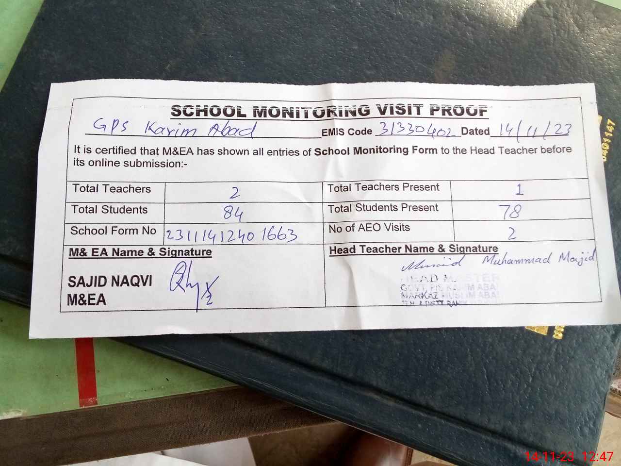 | EMIS Code: 31330402 | Name of School: GPS KARIM ABAD | |||