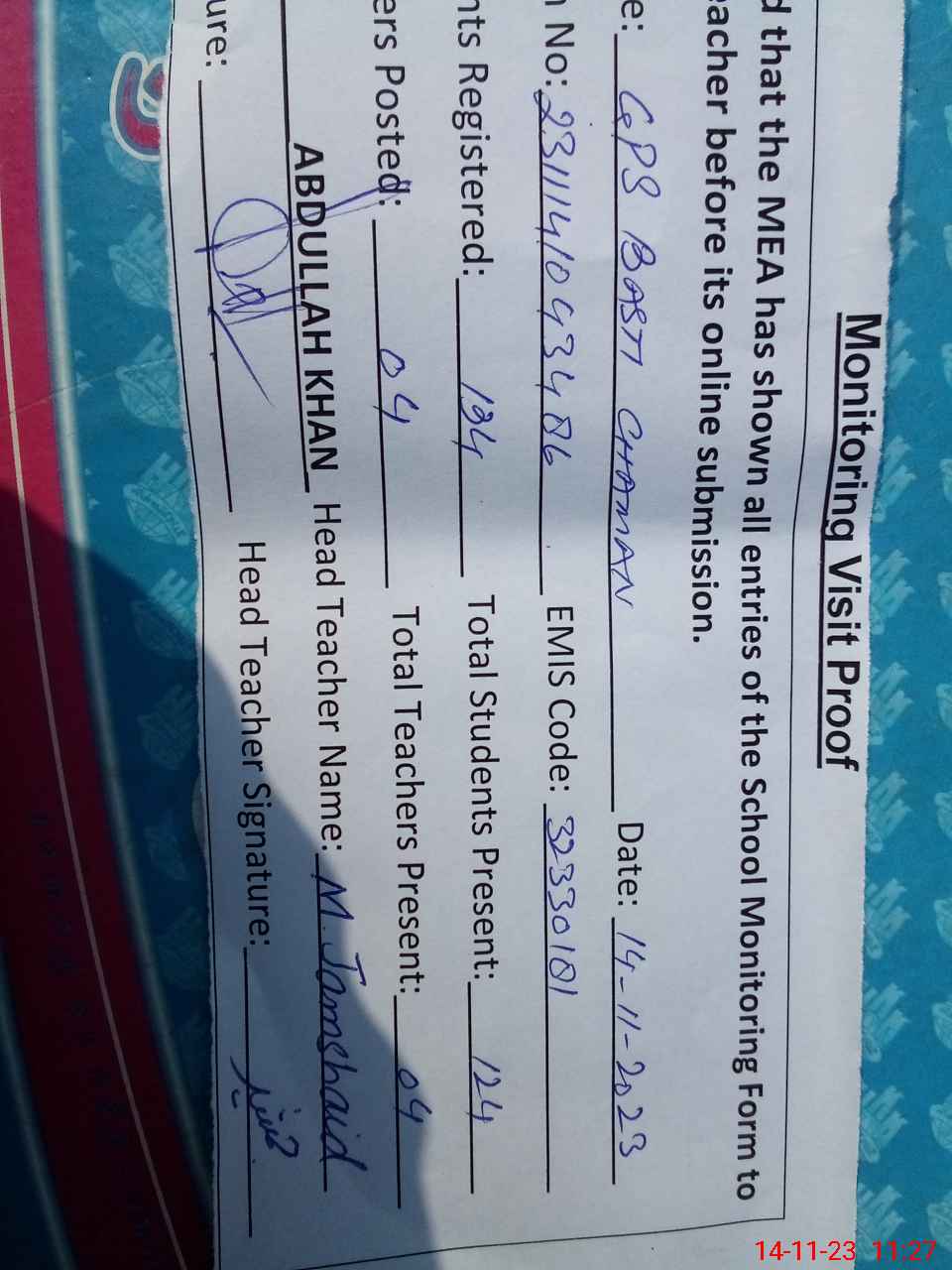 | Attendance Register | Head Teacher | MEA with School | Visit Proof |