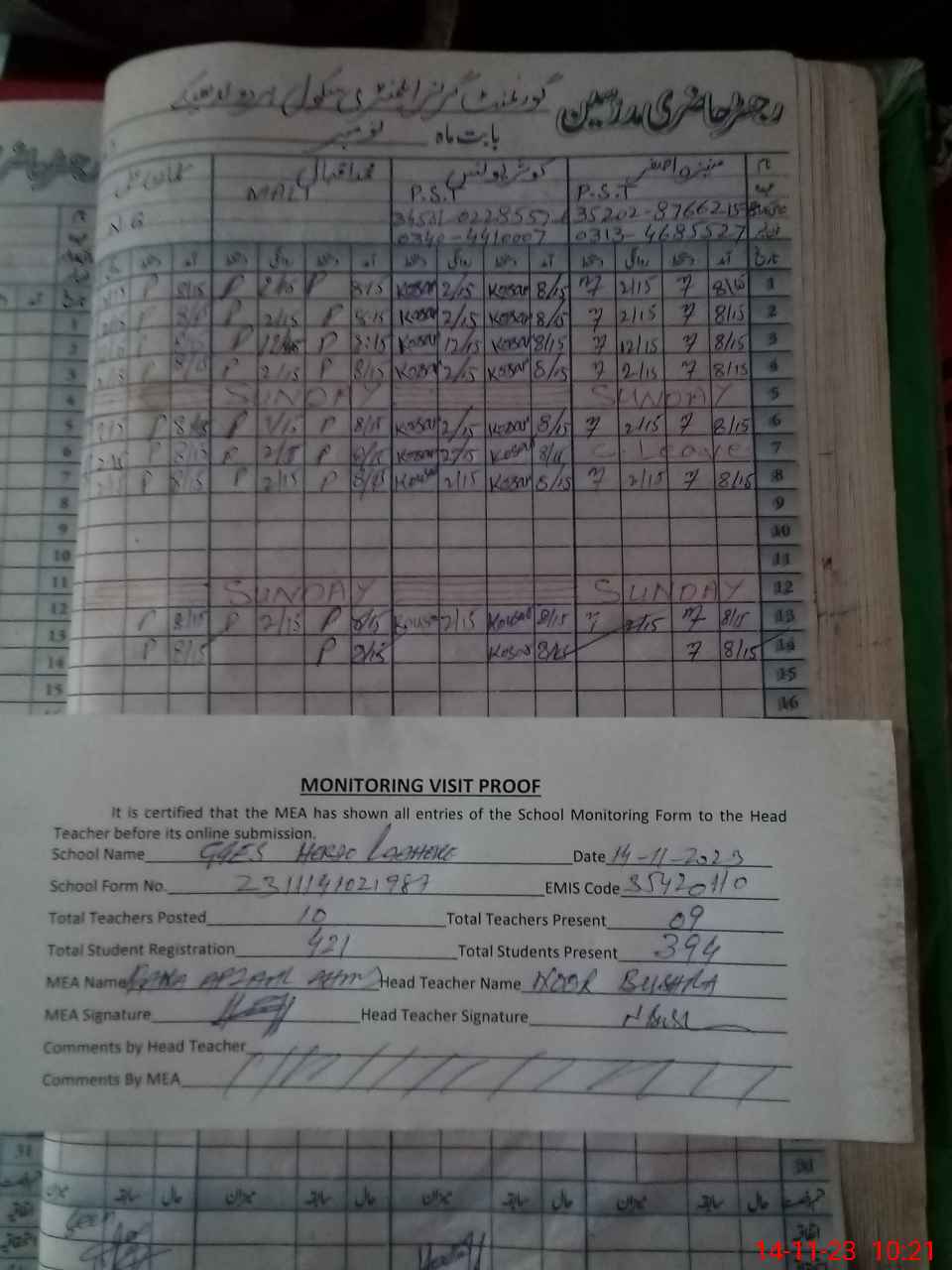 | Attendance Register | Head Teacher | MEA with School | Visit Proof |