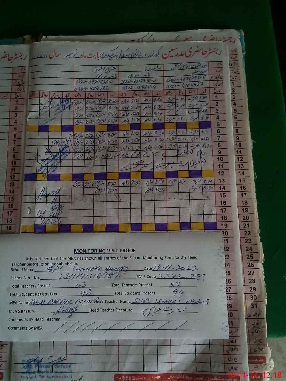 | Attendance Register | Head Teacher | MEA with School | Visit Proof |