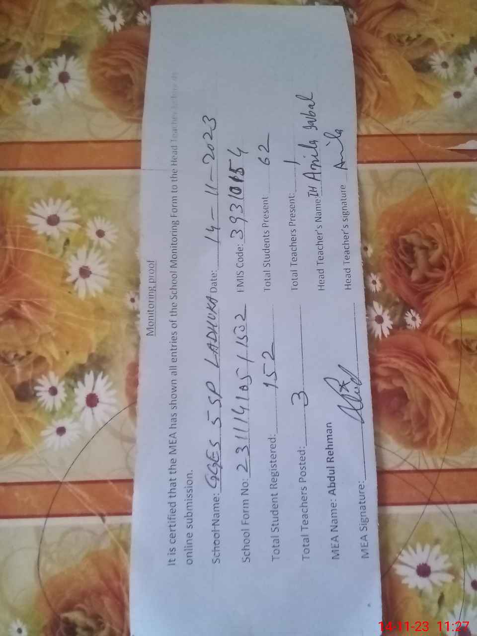 | Remarks (Use Separate Page if Required): Head teacher Mrs sajida begum has gone to ex pakistan and no leave proof is available in school to show MEA | |||||