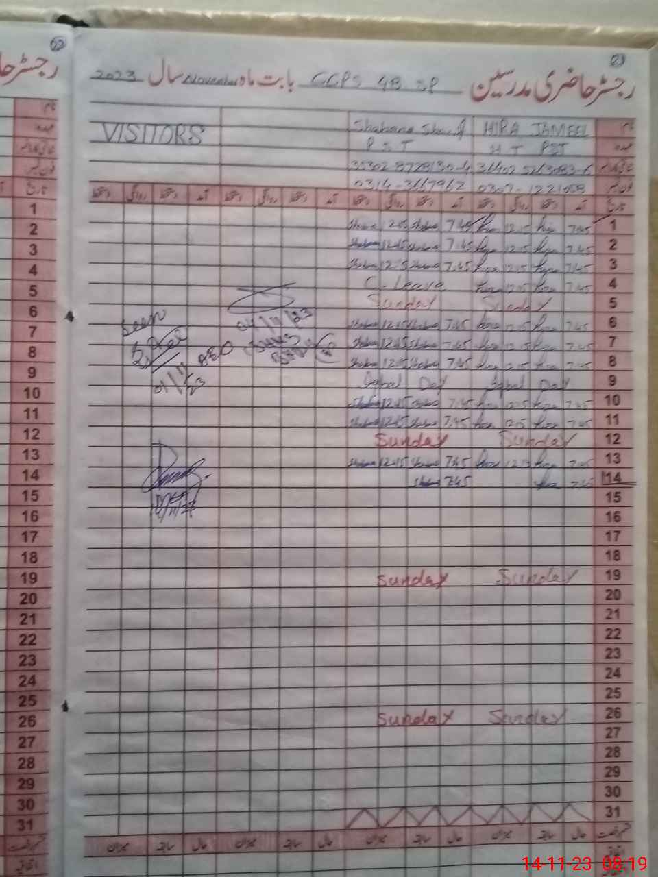 | School Visited by School Health & Nutrition Supervisor (No. of Visits) | 1 | Name1: | Durdana Safdar | Name2: | Nil |