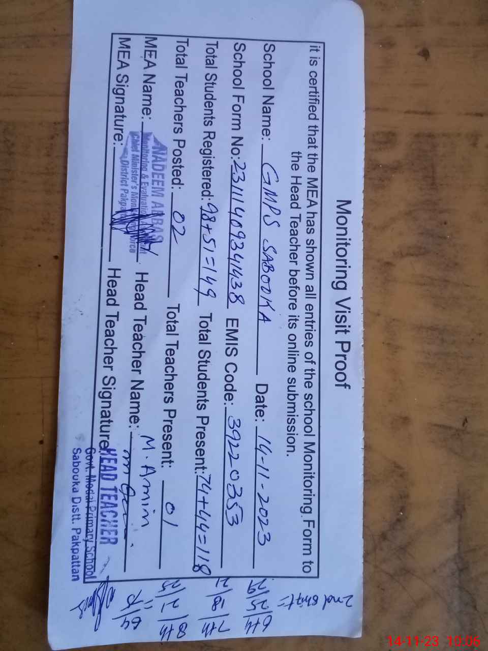| Attendance Register | Head Teacher | MEA with School | Visit Proof |