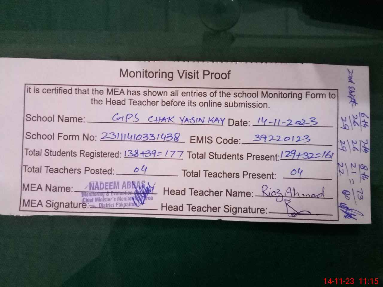 | Attendance Register | Head Teacher | MEA with School | Visit Proof |