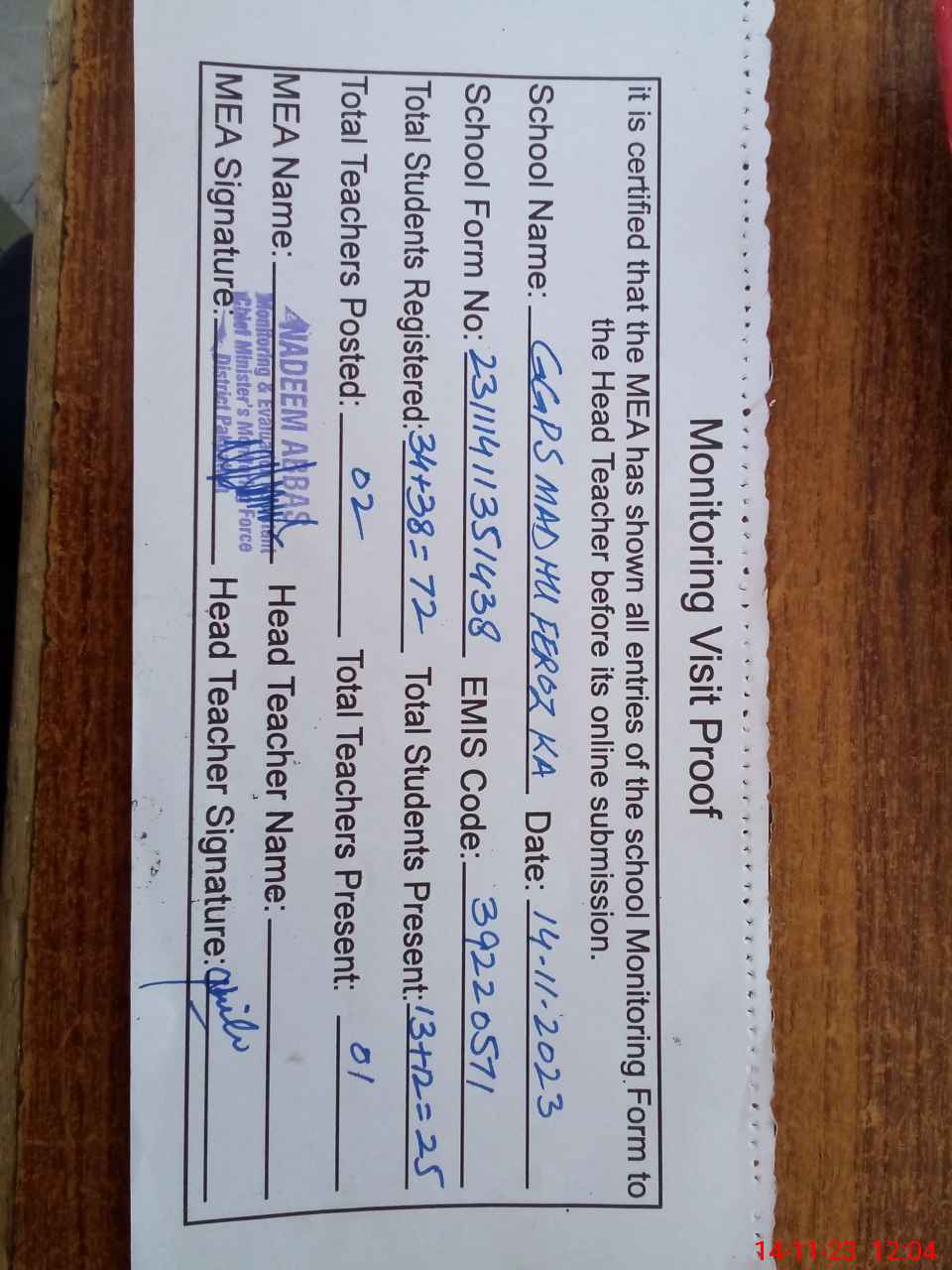 | EMIS Code: 39220571 | Name of School: GGPS MADHU FEROZ KA | |||