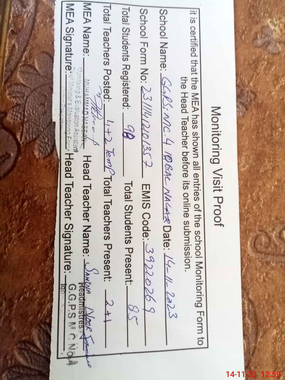 | EMIS Code: 39220269 | Name of School: GGPS MC NO. 4 IQBAL NAGAR ARIFWALA | |||