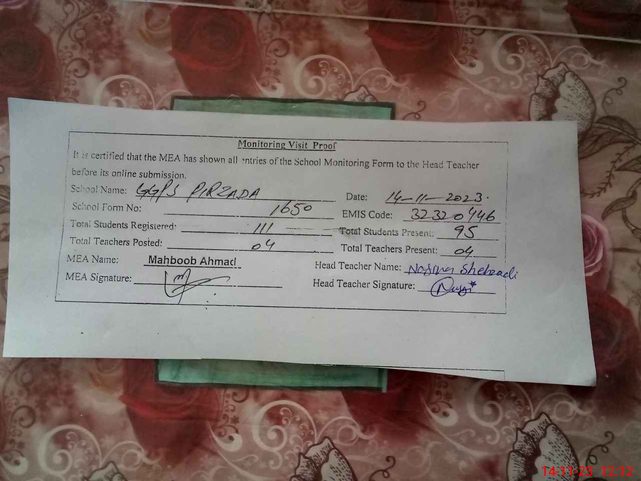 | Attendance Register | Head Teacher | MEA with School | Visit Proof |