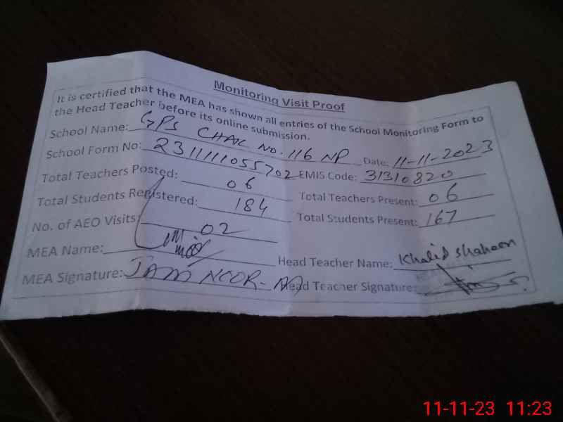 | Attendance Register | Head Teacher | MEA with School | Visit Proof |