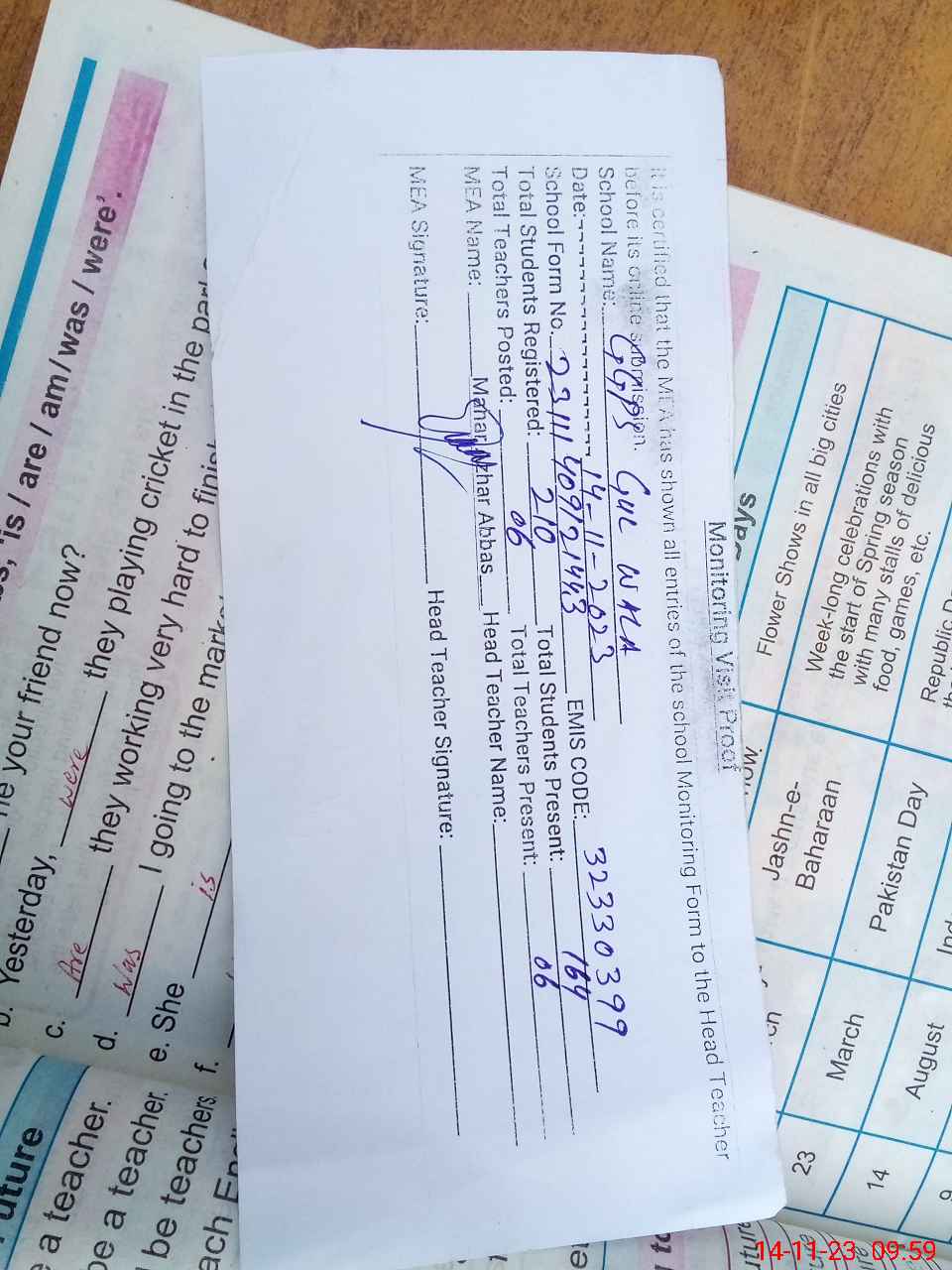 | Attendance Register | Head Teacher | MEA with School | Visit Proof |