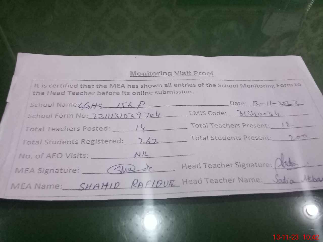 | Attendance Register | Head Teacher | MEA with School | Visit Proof |