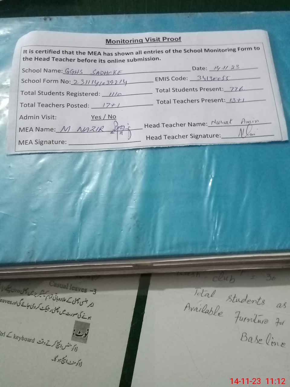 | Attendance Register | Head Teacher | MEA with School | Visit Proof |