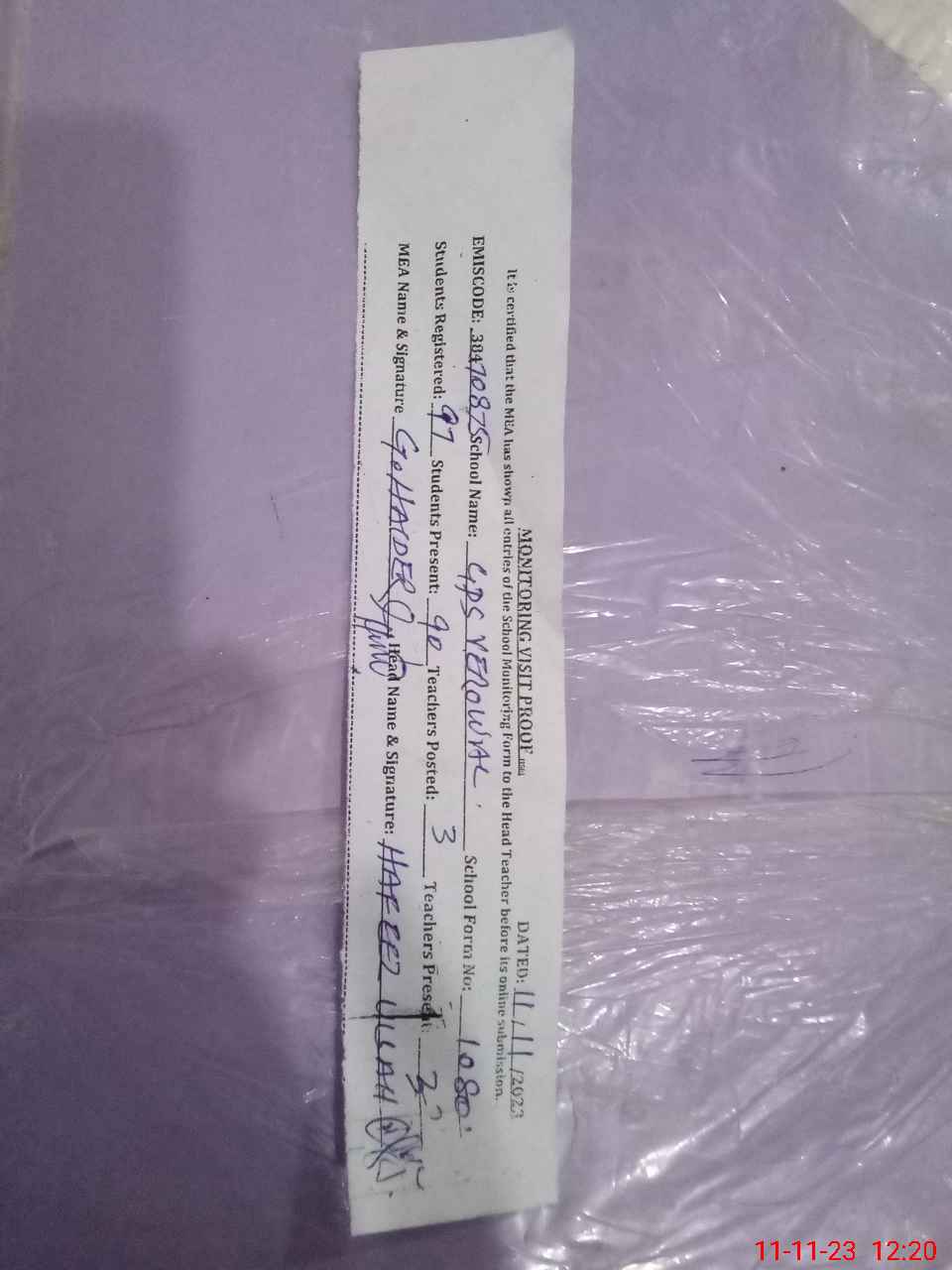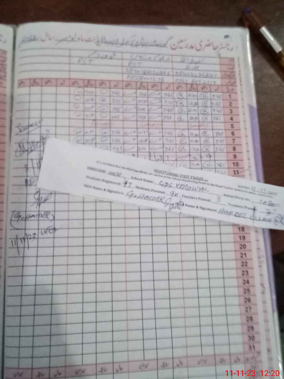 | Attendance Register | Head Teacher | MEA with School | Visit Proof |