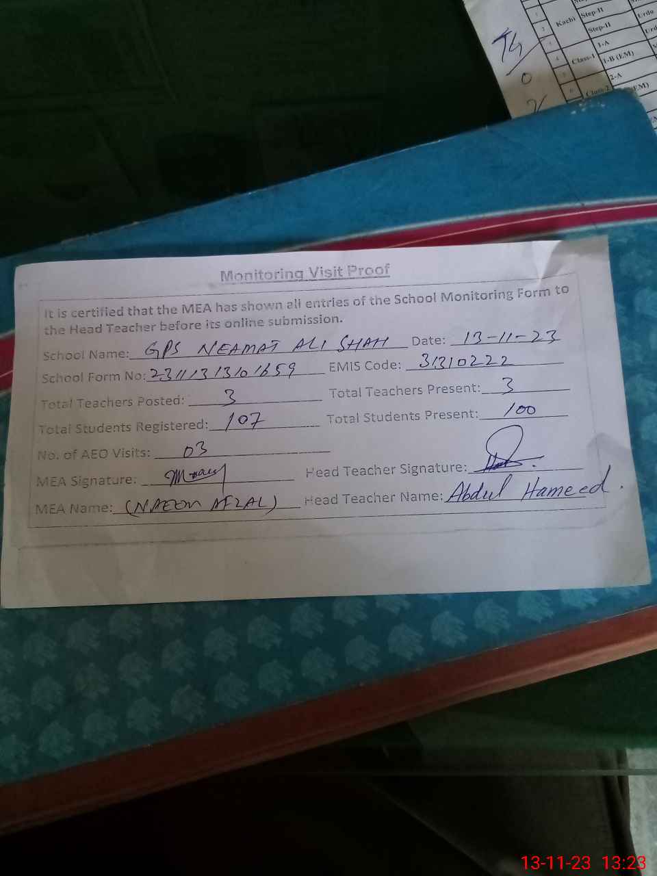 | EMIS Code: 31310222 | Name of School: GPS NEAMAT ALI SHAH | |||