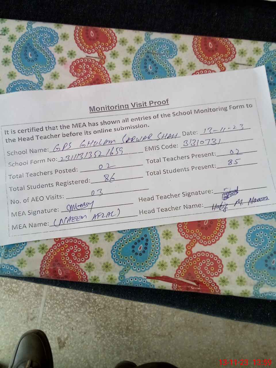 | EMIS Code: 31310731 | Name of School: GPS GHULAM SARWAR SHAH | |||